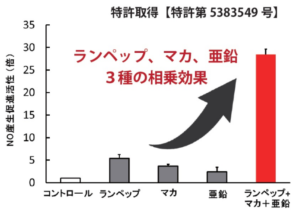 そしてランペップに加えて、特許を取得した配合量のマカと亜鉛を摂取することで、さらに血流促進効果が高められるんです。