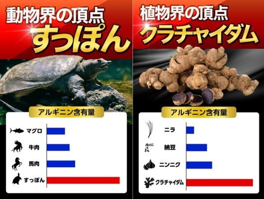 | 主要成分 | すっぽん、クラチャイダム、アルギニン、トンカットアリ、シトルリン、テストフェン、アストラジン、ショウガ、ヒハツ、トリプトファン、フランス産松樹皮、豚睾丸エキス、天種三参、亜鉛、豚肝臓エキス、ビタミンB1、ビタミンB2、ビタミンB6 |